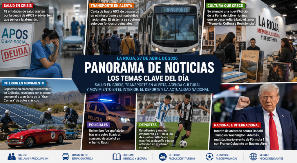 La jornada informativa en La Rioja está atravesada por una combinación de conflictos estructurales, actividad institucional y agenda cultural, con impacto directo en la vida cotidiana de la población. La crisis en el sistema de salud y el transporte público encabezan las preocupaciones, mientras que el ámbito cultural y deportivo aporta dinamismo al escenario provincial.