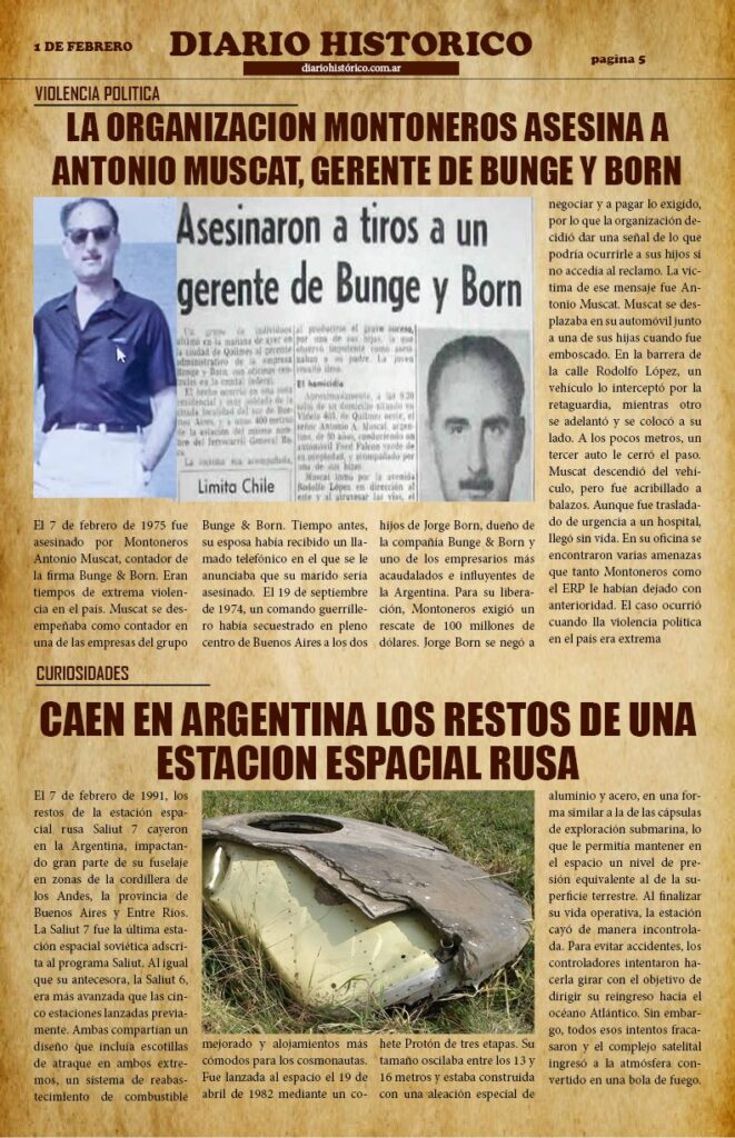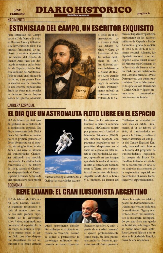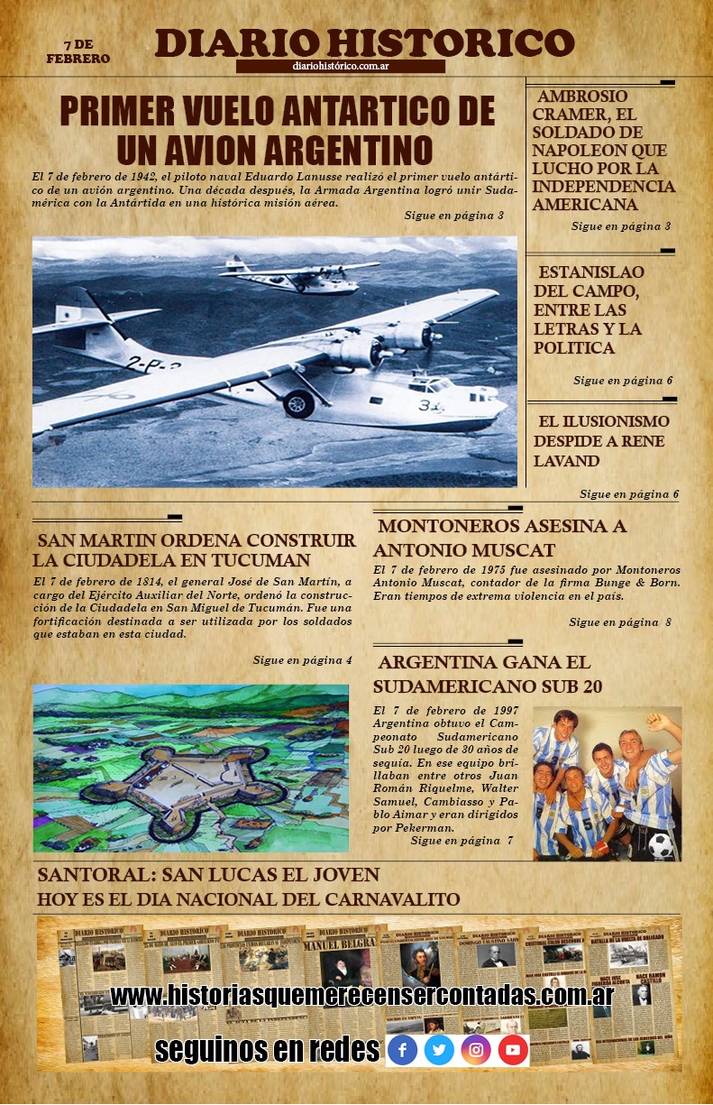 Nacional Efemérides del 7 de febrero RadioLaRioja 7 de febrero de 2026 1 min de lectura About The Author RadioLaRioja See author's posts Navegación de entradas Anterior: Portadas de Diarios de Argentina Sabado 7 de FebreroSiguiente: Henry Kissinger y la Inteligencia Artificial: ¿el fin de la historia humana? Deja una respuesta Cancelar la respuestaLo siento, debes estar conectado para publicar un comentario. Relacionadas 1 min de lectura Nacional Resumen de lo más importante del Boletín Oficial de la República Argentina del 09/03/2026: RadioLaRioja 10 de marzo de 2026 2 min de lectura Justicia Nacional ”CHAU REGGEATÓN”: LA POLICÍA FEDERAL ARGENTINA EXTRADITÓ A UN CANTANTE CHILENO IMPUTADO POR “SECUESTRO EXTORSIVO” RadioLaRioja 9 de marzo de 2026 1 min de lectura Nacional Fuerte temporal en Mendoza: derrumbes, casas inundadas y personas varadas en la montaña RadioLaRioja 9 de marzo de 2026