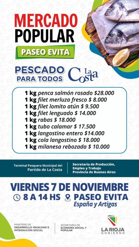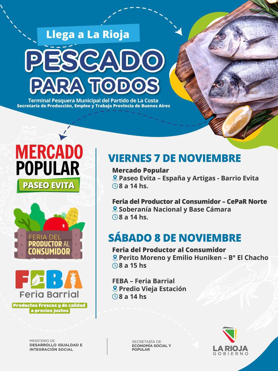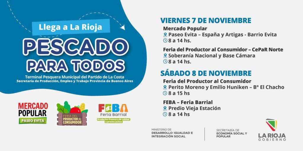 Este fin de semana, La Rioja será sede del programa “Pescados para Todos”, una iniciativa que busca garantizar el acceso a alimentos saludables y de calidad a valores accesibles. La propuesta se desarrollará los días viernes 7 y sábado 8 de noviembre, a través de ferias y mercados populares ubicados en distintos puntos de la ciudad capital.