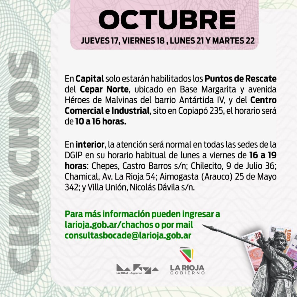 El Gobierno de La Rioja, a través del Ministerio de Hacienda y Finanzas Públicas, recuerda que los días lunes 21 y martes 22 de octubre, en Capital, solo estarán habilitados los Puntos de Rescate del Cepar Norte y del Centro Comercial e Industrial.
