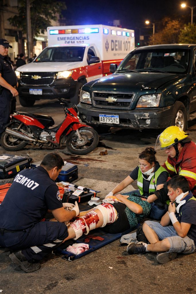 Como consecuencia del fuerte impacto, la conductora de la motocicleta se encontraba consciente y orientada en tiempo y espacio, aunque presentaba una fractura expuesta en el miembro inferior izquierdo, una lesión de consideración que requirió atención inmediata. En tanto, el menor que la acompañaba sufrió traumatismos en los miembros superiores y escoriaciones en el rostro.