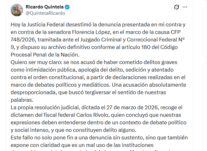 Según el pronunciamiento difundido por el mandatario provincial, el expediente CFP 748/2026 —tramitado ante el Juzgado Criminal y Correccional Federal N.º 9— fue archivado en forma definitiva conforme al artículo 180 del Código Procesal Penal de la Nación. La resolución, fechada el 27 de marzo de 2026, tomó como base el dictamen del fiscal federal Carlos Rívolo, quien concluyó que las manifestaciones cuestionadas se produjeron en un contexto de discusión política y social intensa y que no configuraban ilícitos penales.