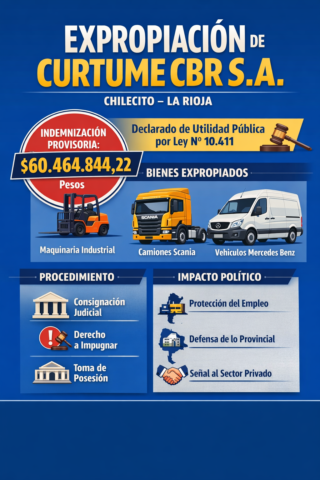 Uno de los anuncios de mayor repercusión fue el edicto relativo a la continuidad del trámite expropiatorio vinculado a CURTUME CBR S.A. (empresa propietaria de planta industrial en el departamento Chilecito), declarado de utilidad pública por la Ley N° 10.411. El decreto de la Función Ejecutiva Provincial N° 265 (30 de septiembre de 2025) enumera la maquinaria, vehículos y bienes muebles que quedarían sujetos a expropiación de urgencia —desde autoelevadores y palas mecánicas hasta camiones Scania y Mercedes Benz— y establece una valuación provisorio consignada judicialmente por el Tribunal de Tasaciones. CURTUME CBR S.A.